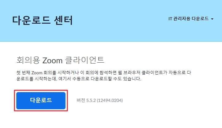 다운로드 센터로 가시면 회의용 줌 클라이언트를 다운로드하실 수 있습니다. 빨간색 체크박스를 해둔 다운로드 버튼을 클릭해주시면 줌 화상회의 다운로드를 할 수 있습니다. 화면 우측 상단의 IT 관리자용 다운로드를 클릭하시면 안되는 점 주의해주세요.
