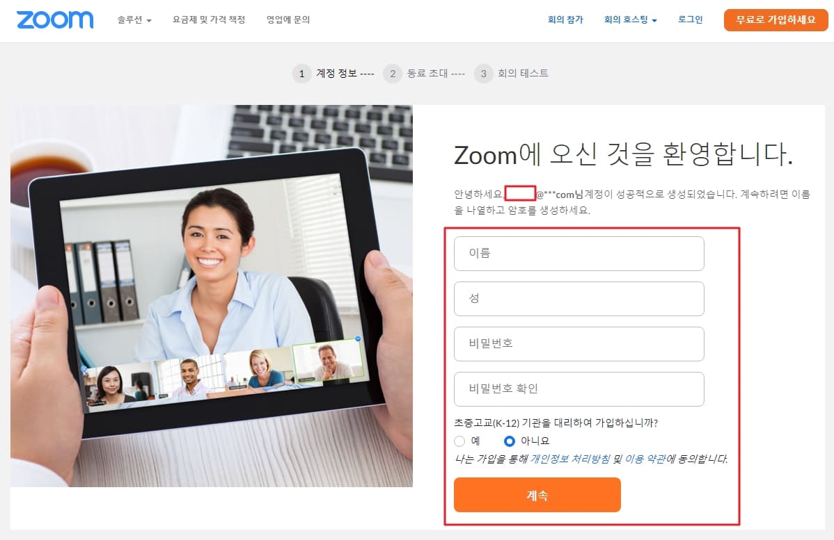 계정 활성화 버튼을 클릭하면 상단과 같은 화면을 확인할 수 있습니다. 본격적으로 줌 가입을 위해 필요한 정보를 기입합니다. 이름, 성, 비밀번호를 기입하시고, 기관을 대리하여 가입하실 경우에는 예, 아닐 경우에는 아니오에 체크한 뒤 계속 버튼을 클릭해주세요.