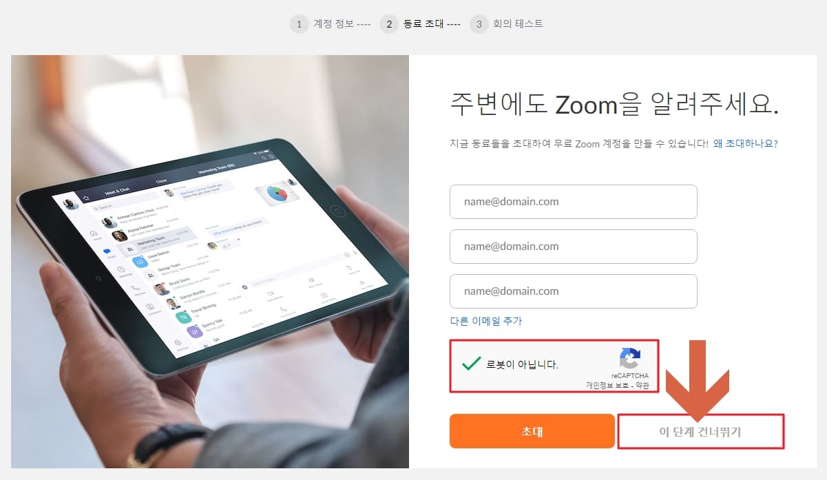 다음 단계로는 주변에도 줌을 알려달라는 홍보 메시지와 함께 메일 주소 기입란이 뜰 텐데 굳이 기입하지 마시고 무시하셔도 상관 없습니다. 하단의 로봇이 아닙니다에는 꼭 체크를 해주셔야 합니다. 체크를 했으면 이 단계 건너뛰기를 눌러주세요.
