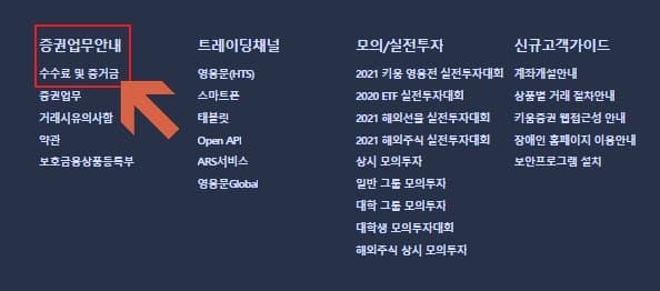메인화면 기준으로 마우스 스크롤을 하단으로 쭉 내려보시면 좌측 하단에 '증권업무안내' 메뉴를 확인하실 수 있습니다. 바로 아래에 있는 '수수료 및 증거금'을 클릭해주세요.
