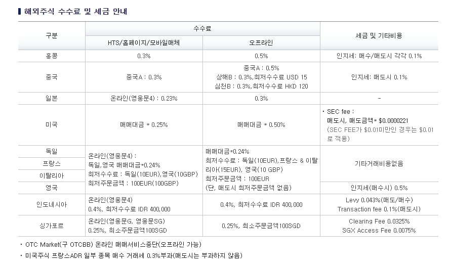 해외주식 수수료도 알아보도록 합니다. 국내 주식투자보다는 상대적으로 수수료가 비싼 편임을 확인하실 수 있습니다.