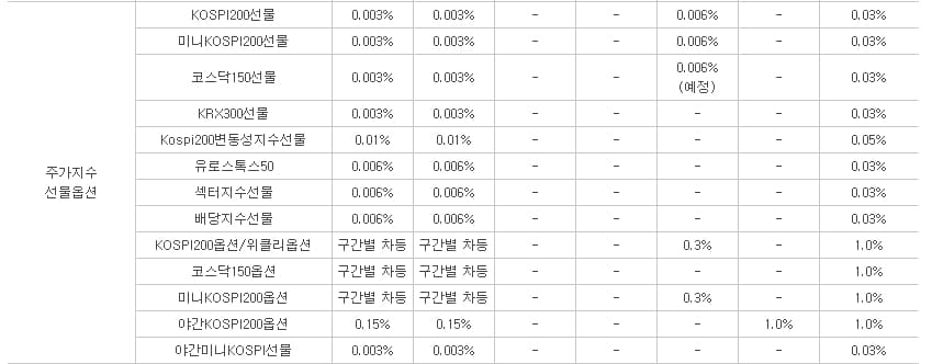 KOSPI200선물을 비롯해 미니KOSPI200선물, 코스닥150선물, KRX300선물은 0.003퍼센트의 수수료가 발생하고 있습니다.