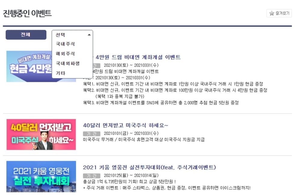 현재 비대면 신규 계좌 개설 시 현금 4만 원을 주는 이벤트를 비롯해 2021 키움 영웅전 실전 투자대회 개최 소식 등을 확인할 수 있는데요.