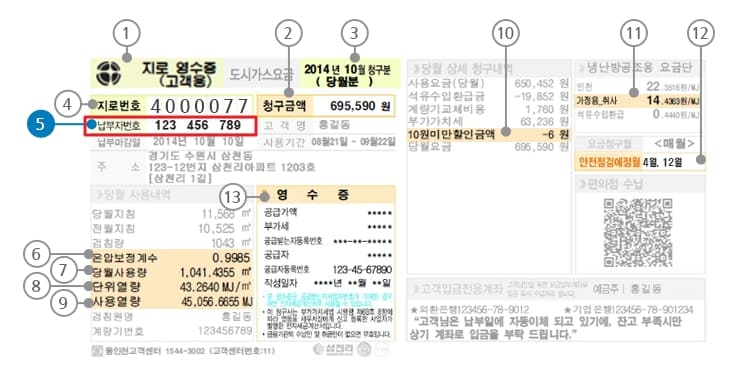 상단 이미지에서 5번 부분의 빨간색 체크박스를 해둔 부분이 바로 납부자번호입니다. 댁으로 수령하신 도시가스 요금 고지서에서 확인하실 수 있습니다. 정말 쉽죠?