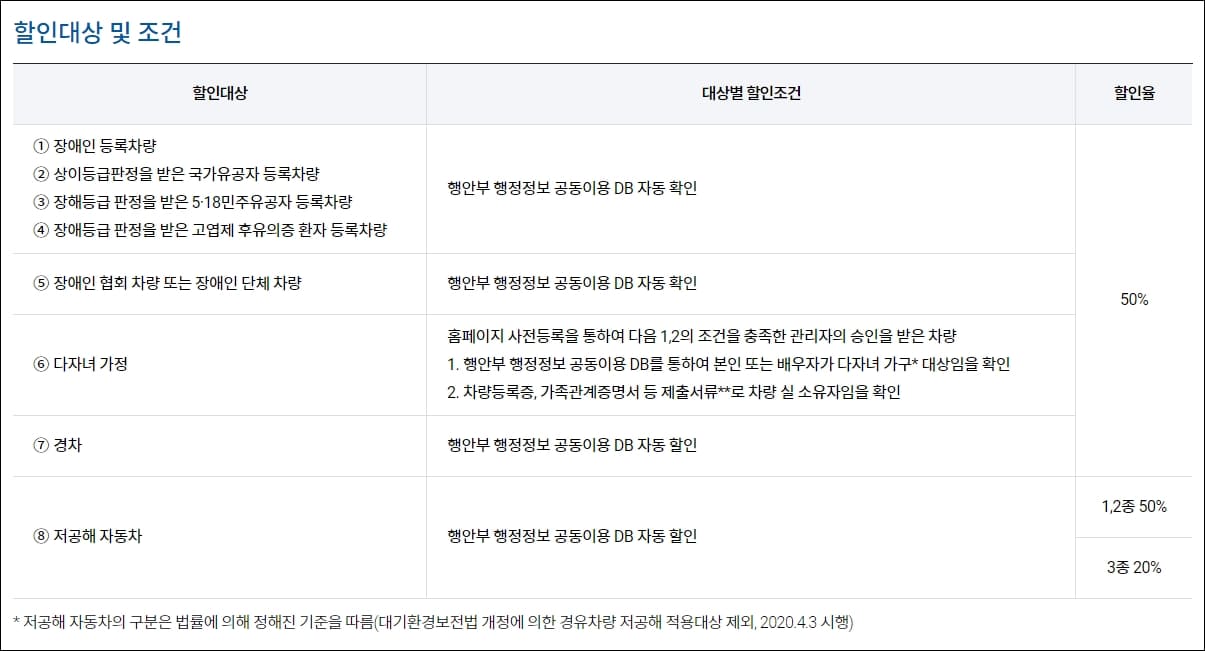 경차, 저공해 자동차 1,2종, 장애인 등록차량, 다자녀, 국가유공자 등 특정 할인대상 및 조건에 포함되는지 확인해보신 뒤 주차요금 할인 혜택을 받아보시길 바랍니다.