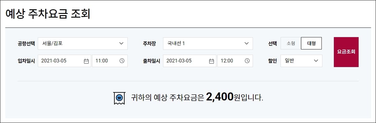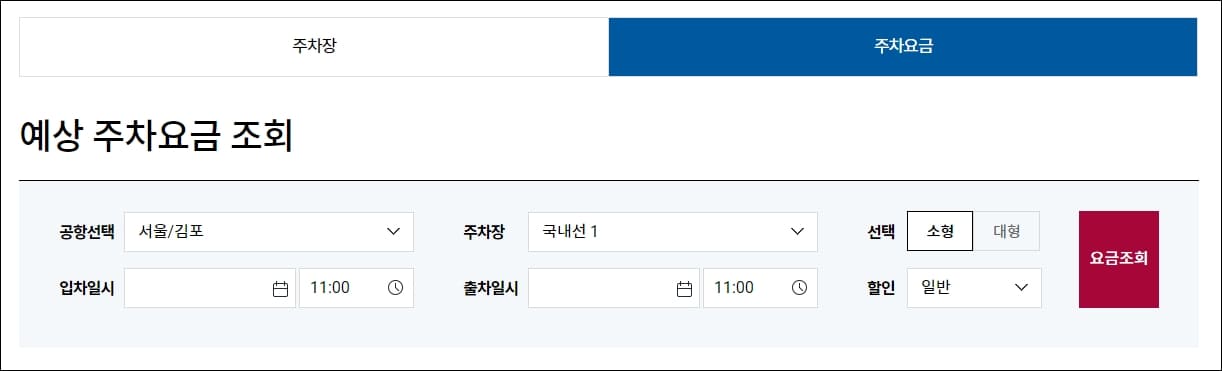 공항명, 주차장, 차량 종류, 입차일시와 출차일시 및 할인혜택 대상 여부를 선택한 뒤 요금을 조회하면 예상 주차요금을 조회하실 수 있는데요.