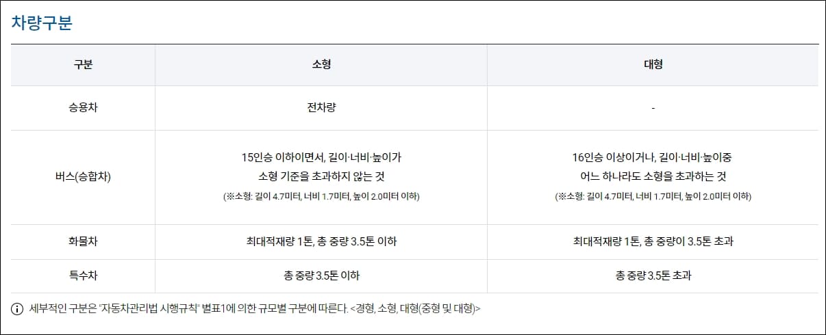 차량 구분은 소형과 대형으로 구분지을 수 있는데요. 전차량이 소형에 해당합니다. 대부분이 아마 이 경우에 해당하시지 않을까 싶습니다.