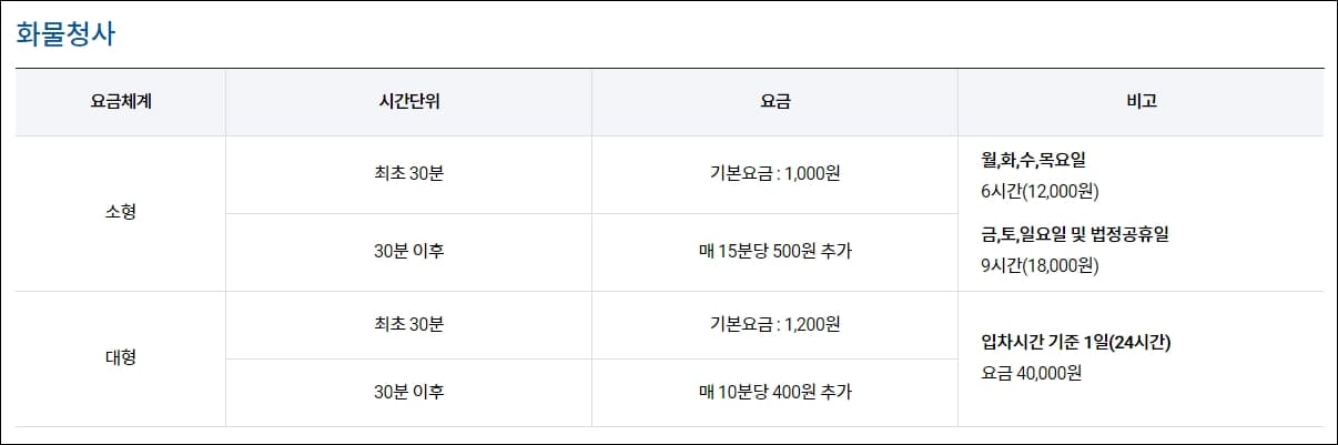 화물청사 주차장을 이용하실 분들도 계실 텐데요. 소형 기준 최초 30분은 기본 요금 1천 원이 적용되며, 30분 이후 매 15분당 5백 원이 추가되는 방식입니다.