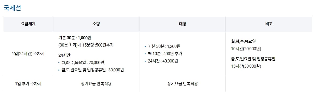 소형 기준 1일(24시간) 주차시 기본 30분에 1천 원이며, 30분이 초과될 때마다 매 15분당 5백 원씩 추가되는 요금 체계입니다. 24시간 풀로 주차시에는 월, 화, 수, 목요일 기준 2만원이고, 금, 토, 일요일 및 법정공휴일에는 3만원입니다.