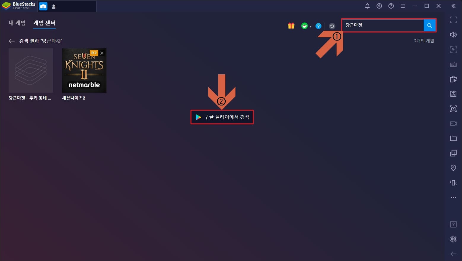 블루스택을 실행한 상태에서 메인화면 기준으로 우측 상단의 검색창에 당근마켓을 입력해주신 뒤 엔터를 치거나 찾기 버튼을 클릭해주세요. 그럼 화면 중앙에 구글 플레이에서 검색 버튼이 뜨게 됩니다. 해당 버튼을 클릭해주세요. 상단 이미지에서 보여지는대로 1번, 2번 순서대로 진행해주시면 됩니다.