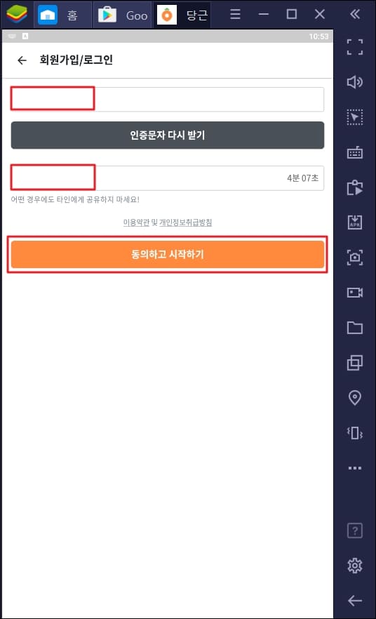 인증 문자가 오지 않았을 경우에는 인증문자 다시 받기를 클릭해주시면 다시 인증 번호를 문자로 받아보실 수 있습니다. 문자로 확인한 인증 번호를 기입한 뒤 동의하고 시작하기 버튼을 클릭해줍니다.