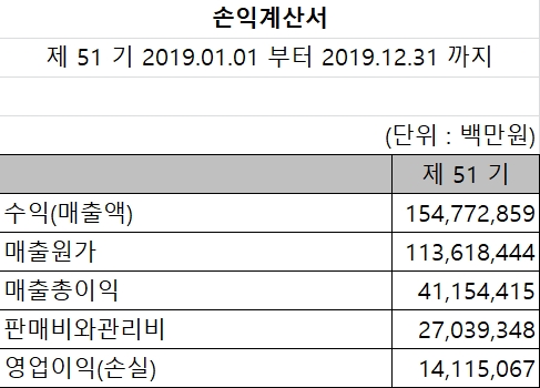실제 손익계산서에서는 백만 원부터 단위를 표기하고 있습니다. 표의 오른쪽 상단을 보시면 단위를 백만 원으로 표기한다고 명시되어있죠? 1원부터 표기하기엔 0이 6개나 더 붙어서 숫자가 너무 길어지기 때문에 편의상 큰 숫자를 약식화 한 거라 보시면 되겠습니다.