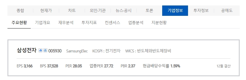 삼성전자를 클릭해서 들어가 보면 '기업 정보' 탭이 있습니다. 삼성전자의 여러 기업정보를 확인하실 수 있을 텐데요.