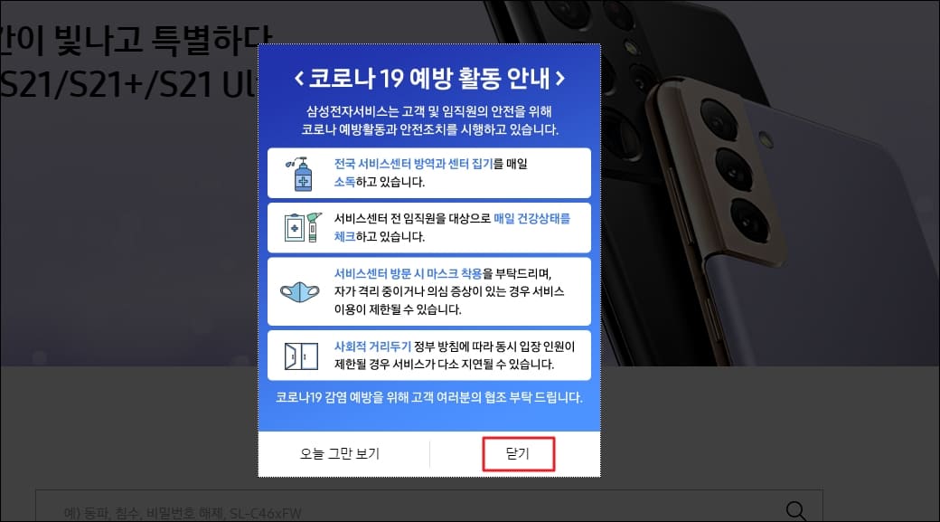 삼성전자 서비스센터 홈페이지로 이동하셨다면 팝업 창은 살포시 닫기를 클릭해주세요.