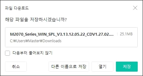 해당 파일을 저장하시겠습니까? 문구와 함께 파일 다운로드 새 창을 확인하실 수 있는데요. 따로 저장할 필요 없이 열기 버튼을 클릭하셔서 삼성전자 프린터 드라이버 다운로드를 진행해주세요.