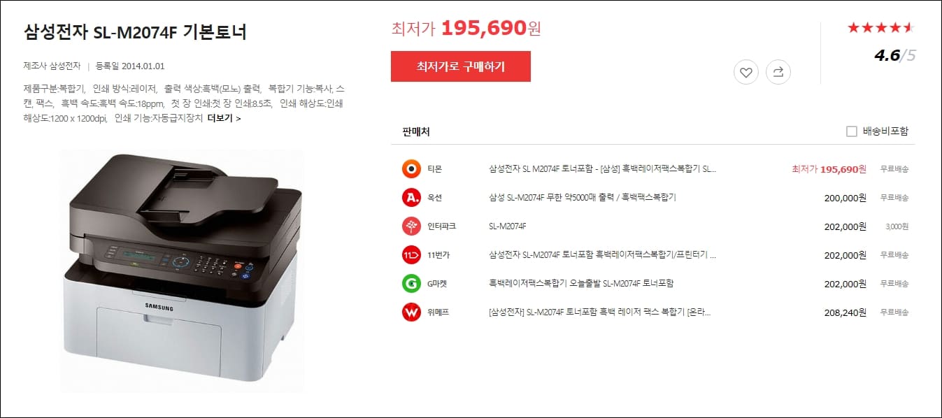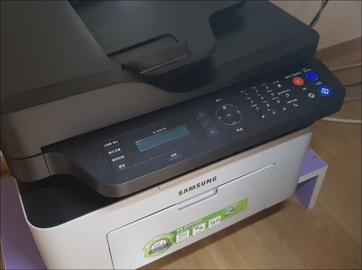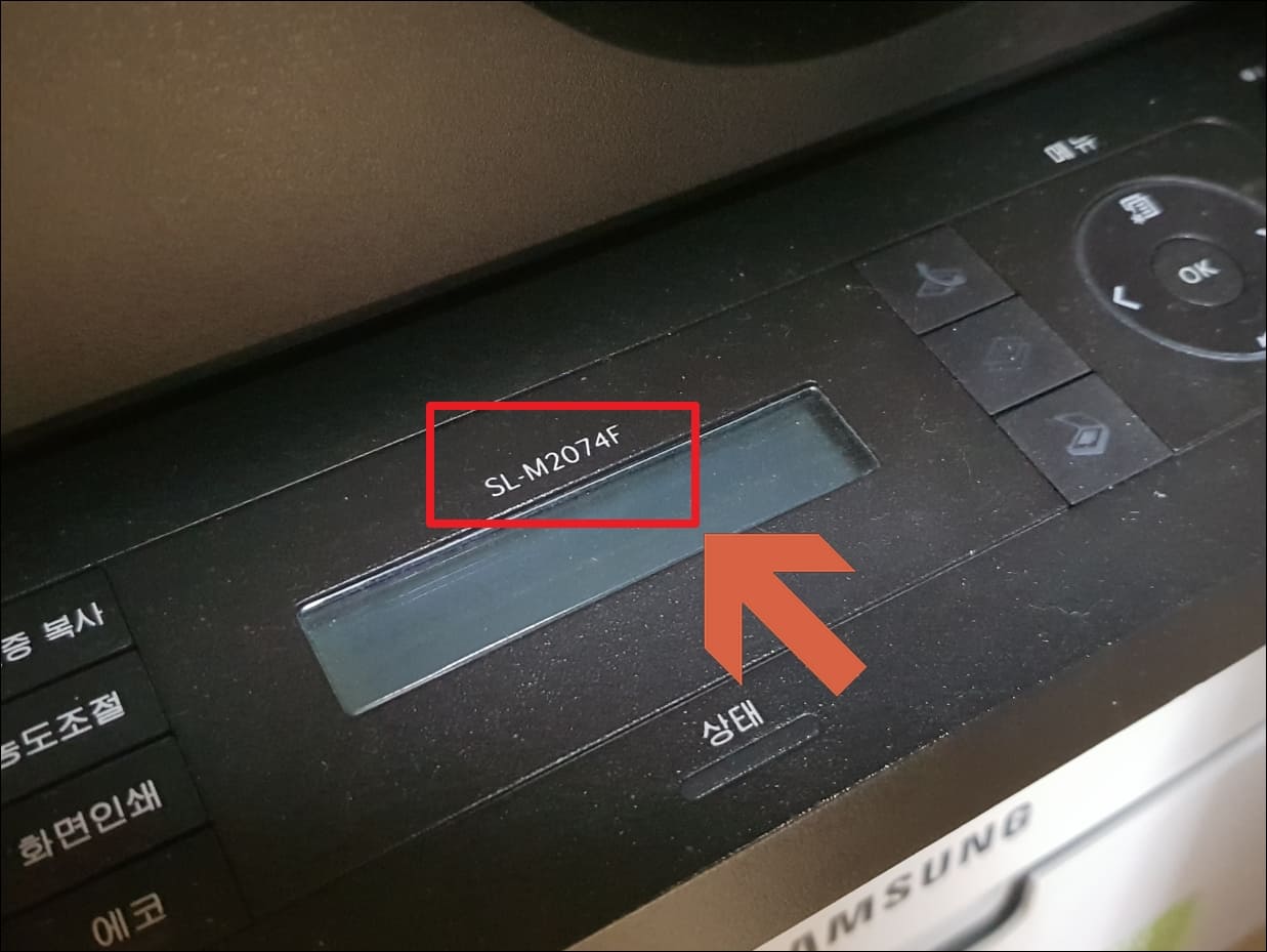 필자의 삼성 프린터는 연식이 좀 된 흑백레이저 복합기이고 모델명은 SL-M2074F입니다. 삼성 프린터는 팩스 기능이 있을 경우 뒤에 F가 붙는다고 알고 있는데 요즘 모델명이 어떻게 나오는지는 잘 모르겠네요.