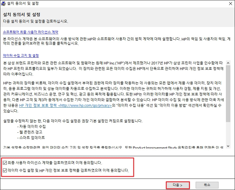 다음으로 설치 동의서 및 설정 화면을 확인하실 수 있습니다. 하단의 두 항목에 체크를 해주신 뒤 우측 하단의 다음 버튼을 클릭해주세요.
