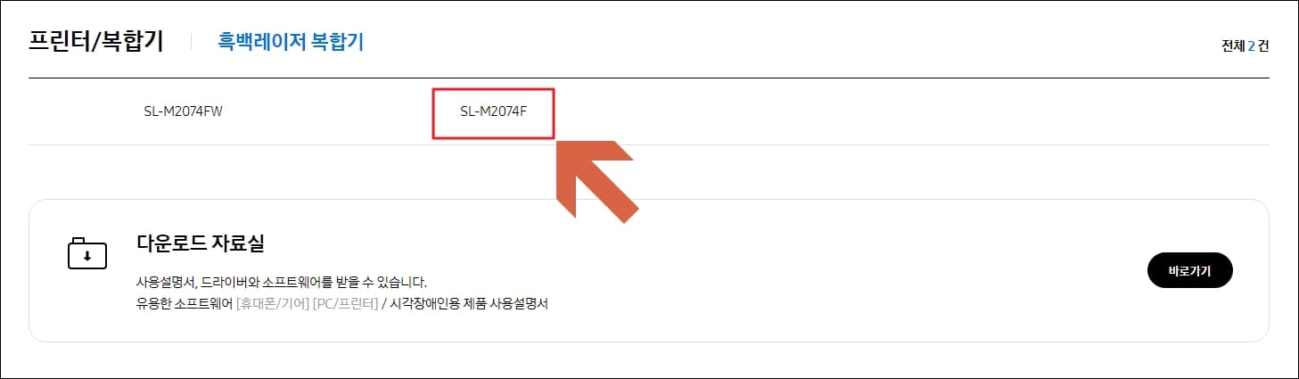 검색 결과가 나왔다면 모델명을 클릭해주시면 삼성 프린터 드라이버 다운로드 페이지로 이동합니다.