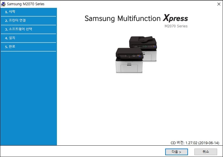 필자의 경우는 삼성 M2070 Series 프린터 드라이버 다운로드 설치 화면이 뜨고 있는데요. 여러분 화면 기준으로는 현재 보유 중이신 프린터 관련 화면으로 아마 확인되실 겁니다. 하단의 다음 버튼을 클릭하여 계속해서 진행해주시면 됩니다.