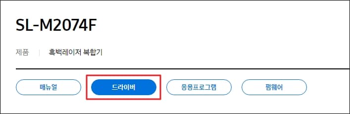 프린터 모델명 하단에 매뉴얼, 드라이버, 응용프로그램, 펌웨어 메뉴를 확인하실 수 있을 텐데요. 삼성 프린터 드라이버 다운로드를 위해 '드라이버' 메뉴를 클릭해줍니다.