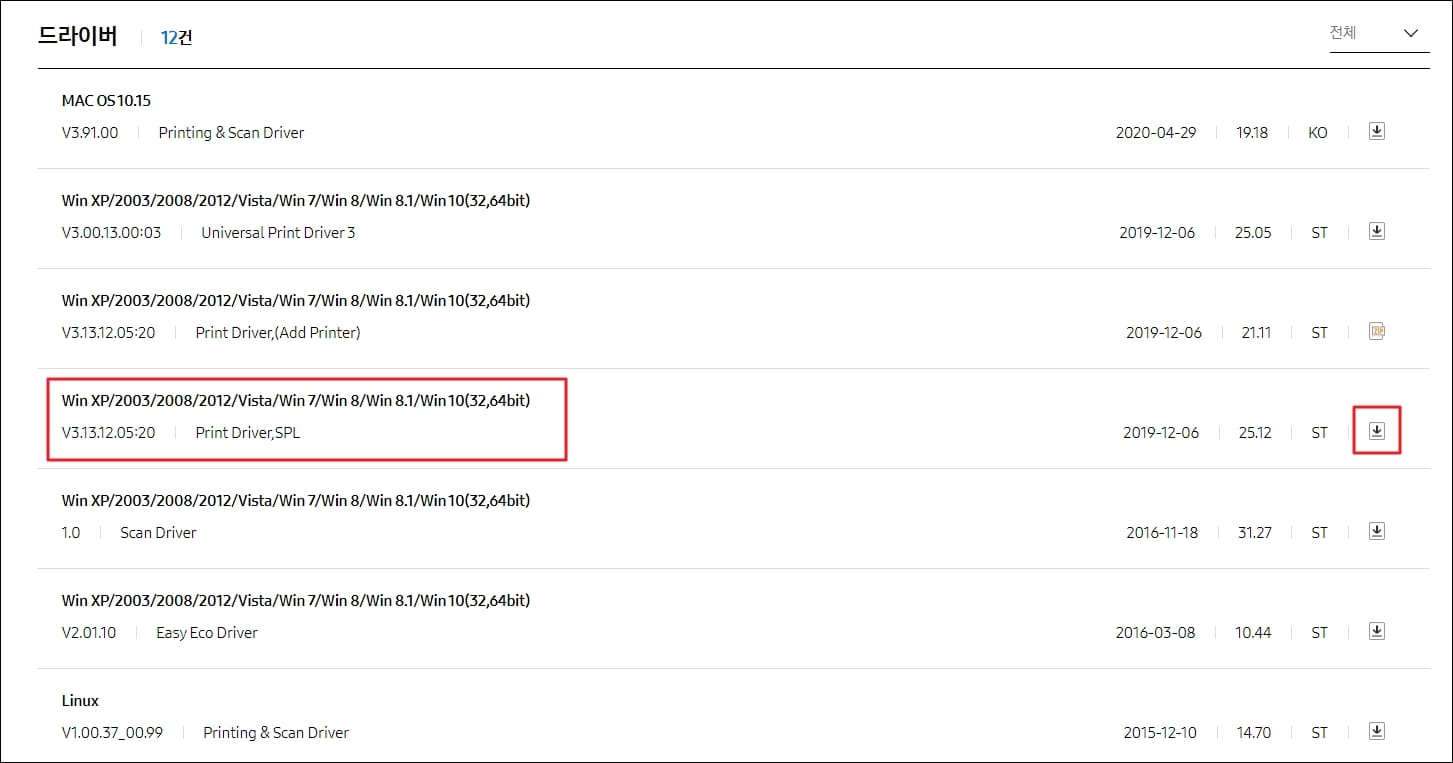 드라이버가 총 12건이나 검색되는 것을 확인할 수 있습니다. 이 중에서 여러분이 사용 중이신 컴퓨터 운영체제(윈도우, 맥, 리눅스 등)에 맞춰서 적합한 드라이버를 골라 다운로드해주시면 됩니다.