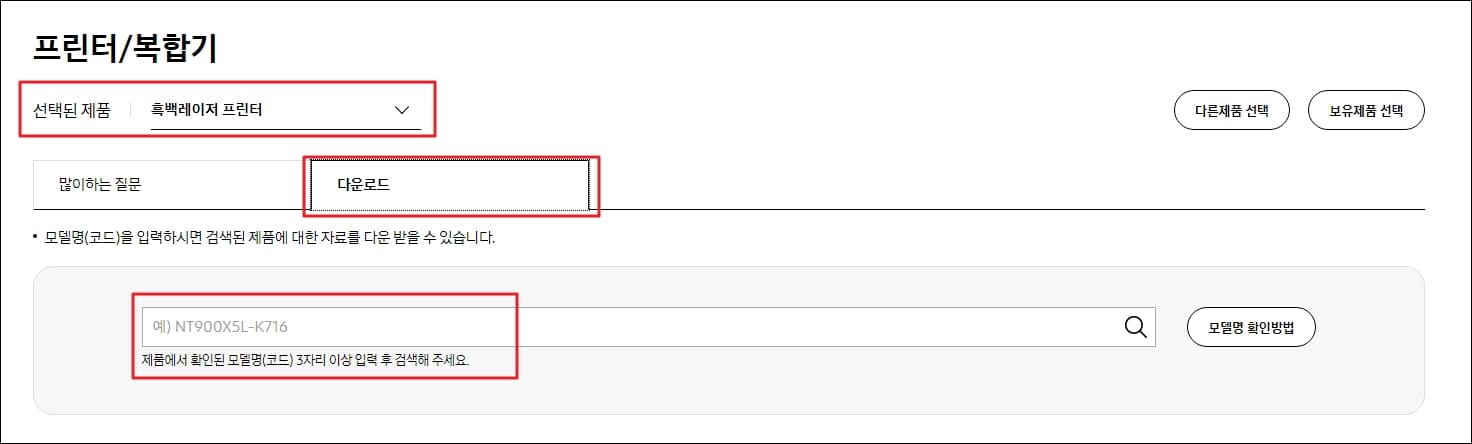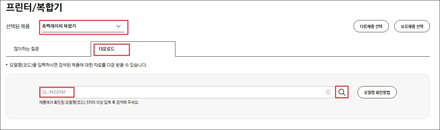 프린터 종류를 선택한 뒤 하단의 메뉴 중 '다운로드' 탭을 클릭해주세요. 그리고 프린터 모델명을 입력하는 창에 여러분이 보유 중인 삼성 프린터 모델명을 입력한 뒤 엔터 또는 돋보기 아이콘을 클릭해줍니다.