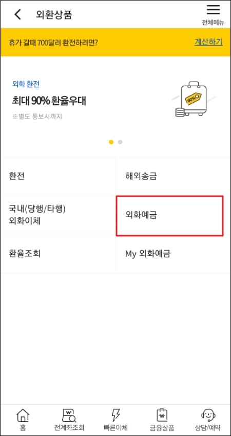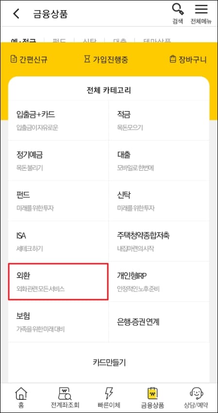 금융상품 메뉴 중에서 외화 관련 모든 서비스를 제공하는 '외환' 메뉴를 클릭해줍니다.