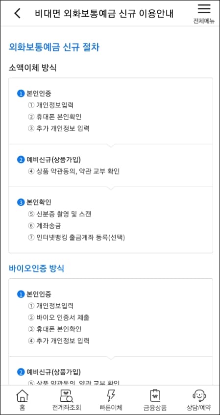 KB외화보통예금에 가입하기 위한 신규 절차는 소액이체 방식, 그리고 바이오 인증 방식의 총 2가지의 방식으로 분류됩니다. 어떤 방식으로 진행하시는 것이 더 편한지 선택하셔서 진행하시면 되겠습니다.