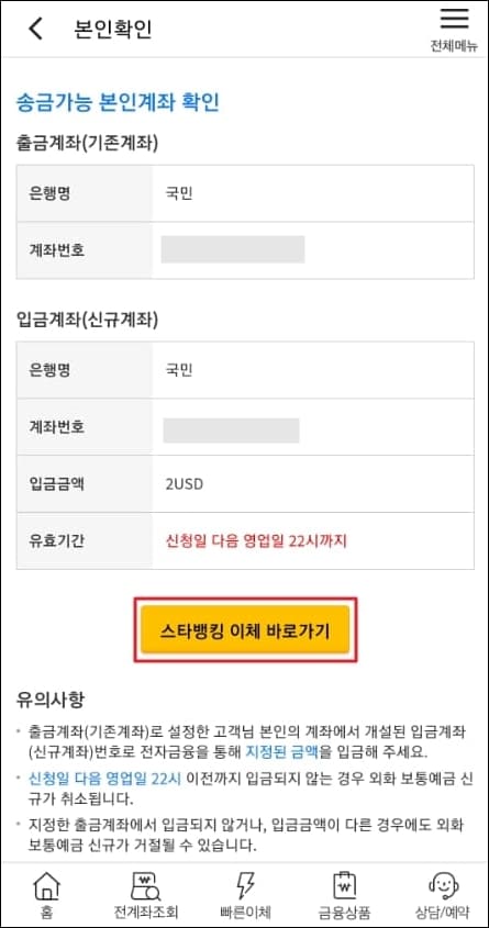 만약 신청일 다음 영업일 22시 이전까지 입금되지 않을 경우에는 국민은행 외화통장 비대면 계좌개설이 취소됩니다.