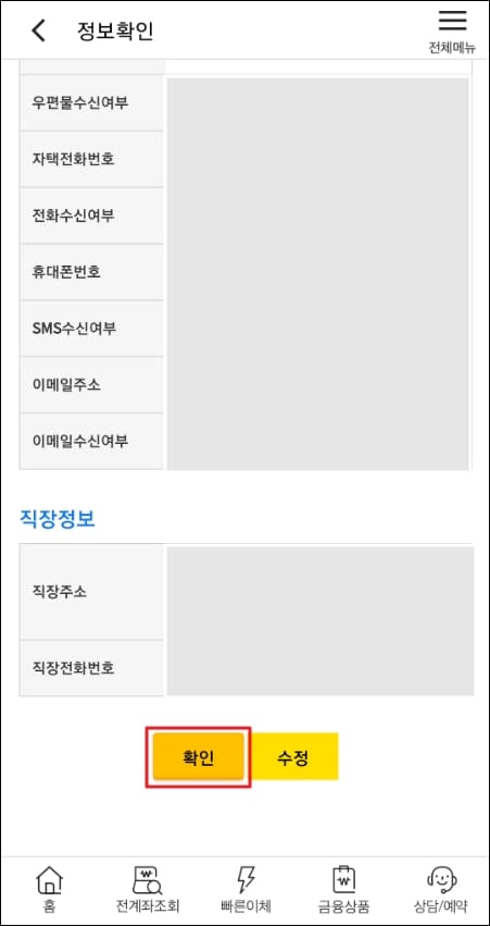 기본 정보 및 직장 정보를 확인해주신 뒤 하단의 노란색 확인 버튼을 클릭해줍니다.