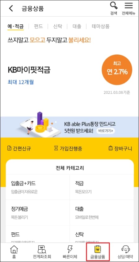 메인화면에서 하단 메뉴 중 '금융상품'을 클릭해주세요.