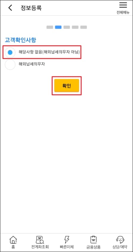 고객 확인 사항 단계입니다. 해당사항 없음(해외납세의무자 아님)에 체크한 뒤 노란색 확인 버튼을 클릭해줍니다. 만약 해외납세의무자라면 하단 항목에 체크를 해주셔야겠죠?