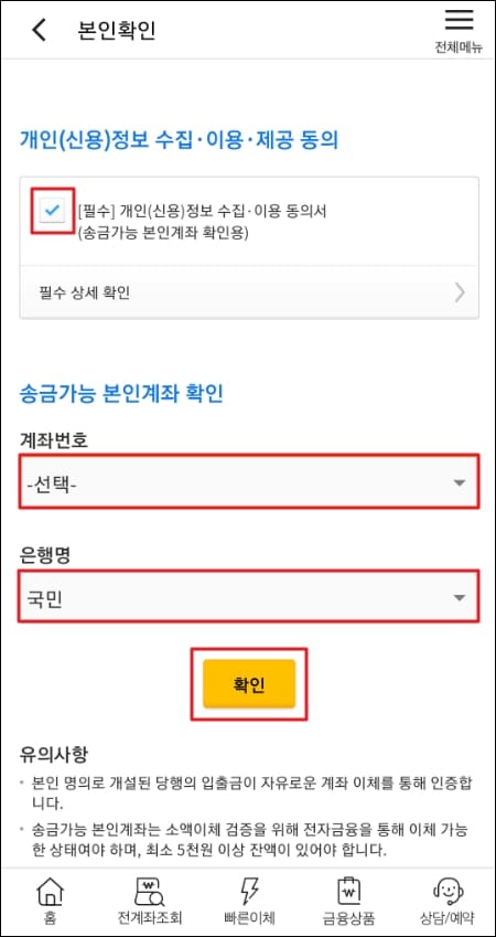 개인 정보 수집, 이용, 제공 동의에 체크를 해주신 뒤 송금 가능한 여러분의 계좌를 확인해주신 뒤 노란색 확인 버튼을 클릭해주세요.