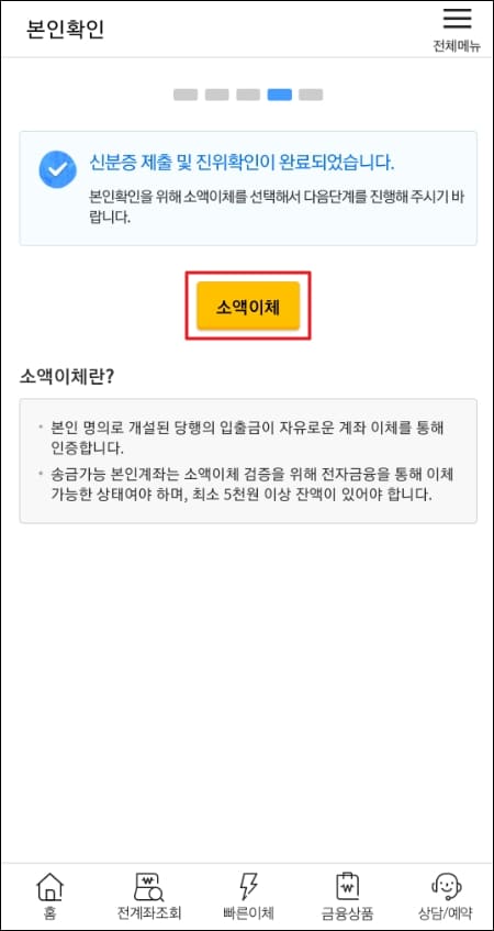 신분증 촬영 절차가 끝났다면 이제 소액이체 단계만 거쳐주시면 됩니다. 노란색 소액이체 버튼을 클릭해주세요.