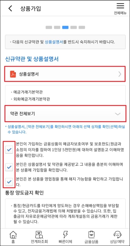 상품 가입 단계입니다. 상품 설명서와 약관 전체보기를 모두 한 번씩 클릭해주셔야 하단의 체크 박스가 활성화됩니다. 모든 체크 박스에 모두 체크를 해주신 뒤 노란색 확인 버튼을 클릭해주시면 됩니다.