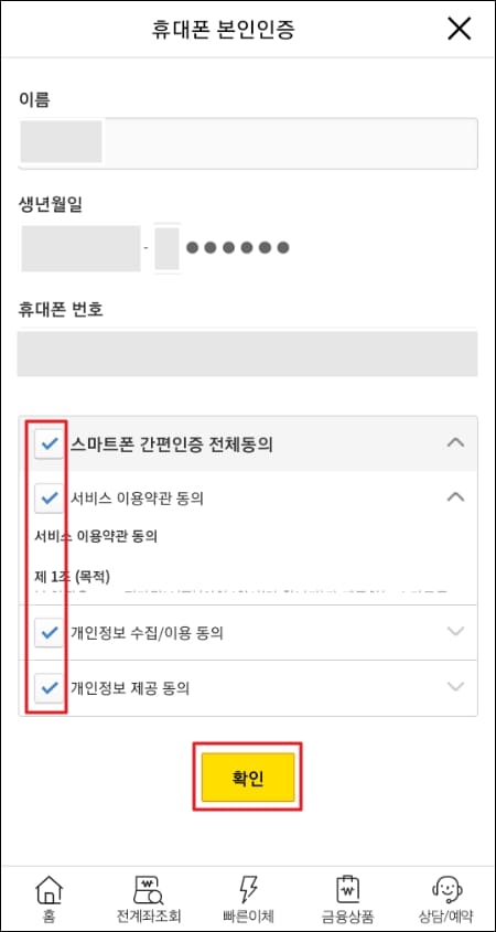 다음 단계는 휴대폰 본인인증 절차를 거치셔야 하는데요. 성함, 생년월일, 휴대폰 번호를 확인하신 뒤 하단의 스마트폰 간편 인증 전체 동의에 체크해주신 뒤 노란색 확인 버튼을 눌러주시면 됩니다.