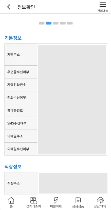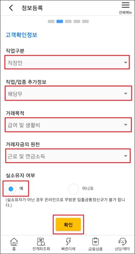 다음 단계로 정보 등록을 해주셔야 합니다. 고객 확인 정보란의 직업 구분, 직업/업종 추가 정보, 거래목적, 거래자금의 원천, 그리고 실소유자 여부를 체크해주셔야 하는데요.