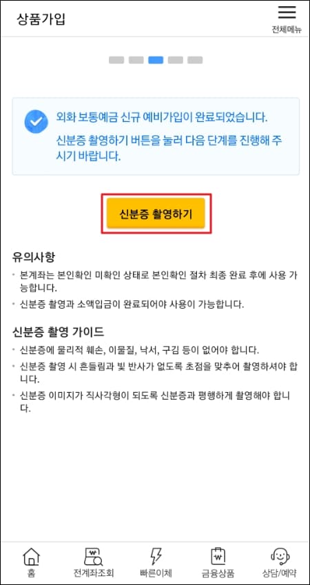 외화 보통예금 신규 예비 가입이 완료되었다는 문구와 함께 이제 신분증 촬영을 해주셔야 합니다.