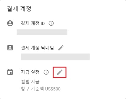그럼 여러분의 구글 애드센스 결제 계정 정보를 확인하실 수 있는데요. 마지막 항목인 지급 일정을 확인하시면 월별 지급 청구 기준액을 확인하실 수 있습니다.