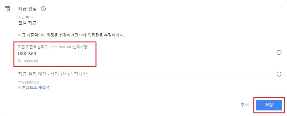 필자의 경우는 사전에 500달러로 설정되어 있었기 때문에 다른 숫자로 바꿔줘야 저장 버튼이 활성화되게 됩니다. 여러분이 목표로 하시는 지급 기준액 숫자를 기입하신 뒤 우측 하단의 저장 버튼을 클릭해주시면 끝입니다.