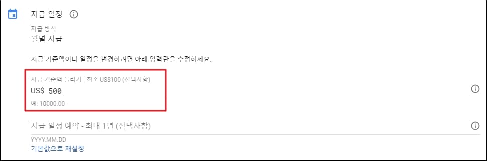 지급 일정 관련 상세 정보를 확인하실 수 있을 텐데요. 지급 기준액 늘리기 항목이 보이실 겁니다. 초기 설정 값인 100달러 이외에 여러분이 받고 싶은 지급 기준액을 숫자로 기입해주시면 됩니다.