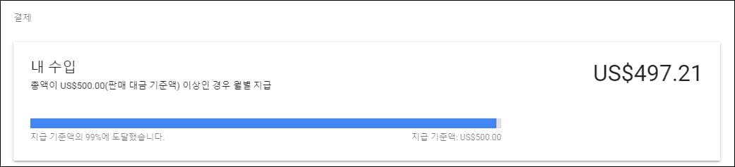 필자의 경우는 이미 사전에 구글 애드센스 지급 기준액을 500달러로 변경해두었기 때문에 500달러로 보이지만, 여러분은 아마 처음이시라면 100달러로 확인이 되실 거에요.