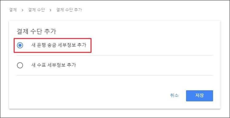 다음 단계로 결제 수단 추가 페이지를 확인하실 수 있습니다. 첫 번째 항목인 '새 은행 송금 세부 정보 추가' 버튼을 클릭해주세요.