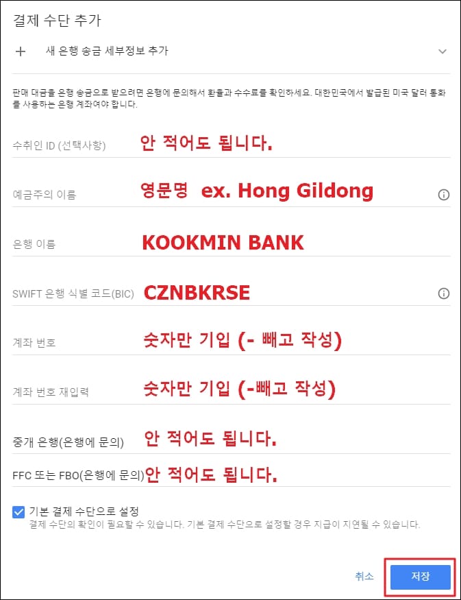 3. 구글 애드센스 계좌 등록 방법 (지급 결제수단 추가) - 국민은행 스위프트 코드(swift)
