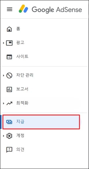 구글 애드센스(Google Adsense)에 로그인 후 지급 메뉴를 선택해 클릭해주세요.