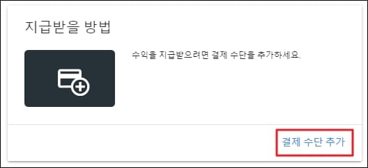 화면 중앙쯤을 확인해보시면 '지급받을 방법' 섹션을 확인하실 수 있습니다. 수익을 지급받기 위해서는 당연히 결제 수단을 추가해주셔야겠죠. 우측 하단의 '결제 수단 추가' 버튼을 클릭해주시면 됩니다.