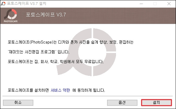 그럼 드디어 포토스케이프 무료다운로드 설치 창을 확인하실 수 있습니다. 일반 가정집은 물론 회사, 학교, 학원 등의 공용 시설에서도 이런 유용한 프로그램을 무료로 사용할 수 있다니 정말 좋은 세상이죠? 계속해서 설치하시려면 화면 우측 하단의 '설치' 버튼을 클릭해주세요.