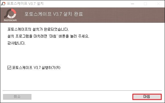 드디어 포토스케이프 무료다운로드가 완료되었습니다. 포토스케이프 3.7버전 실행하기에 체크박스가 되어있는 것을 확인했다면 우측 하단의 '마침' 버튼을 클릭해주시면 포토스케이프가 자동으로 실행됩니다.