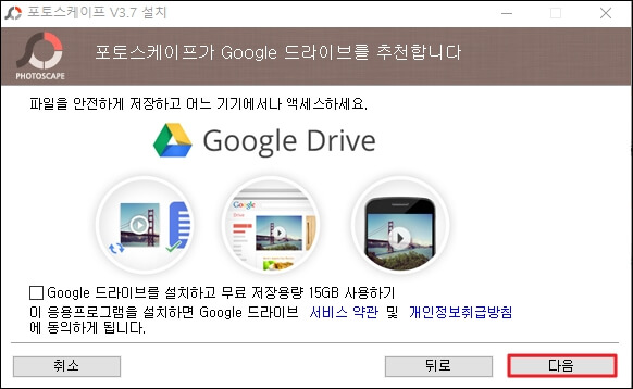 다음 단계로는 구글 드라이브 설치 권유 항목에 자동으로 체크되어 있을 텐데 구글 드라이브 다운로드를 원치 않으실 경우에는 필자처럼 체크 박스를 해제해주신 뒤 우측 하단의 '다음 버튼'을 클릭해주시면 됩니다.