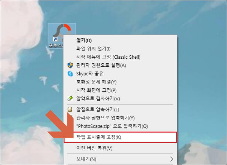 작업 표시줄에 고정해두고 사용하는 방법을 혹시나 모르시는 분들을 위해 간단하게 팁을 드리자면 포토스케이프 바로가기 아이콘 위에 마우스 커서를 둔 상황에서 마우스 오른쪽 버튼을 클릭하시면 메뉴 중에 '작업 표시줄에 고정'을 확인하실 수 있는데요. 해당 항목을 클릭해주시면 끝입니다.